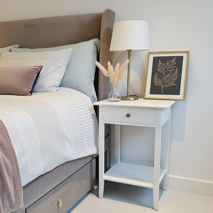 A neat classically styled pedestal with 1 drawer on wooden runners and antique brass knob. Perfect for many rooms and styles.